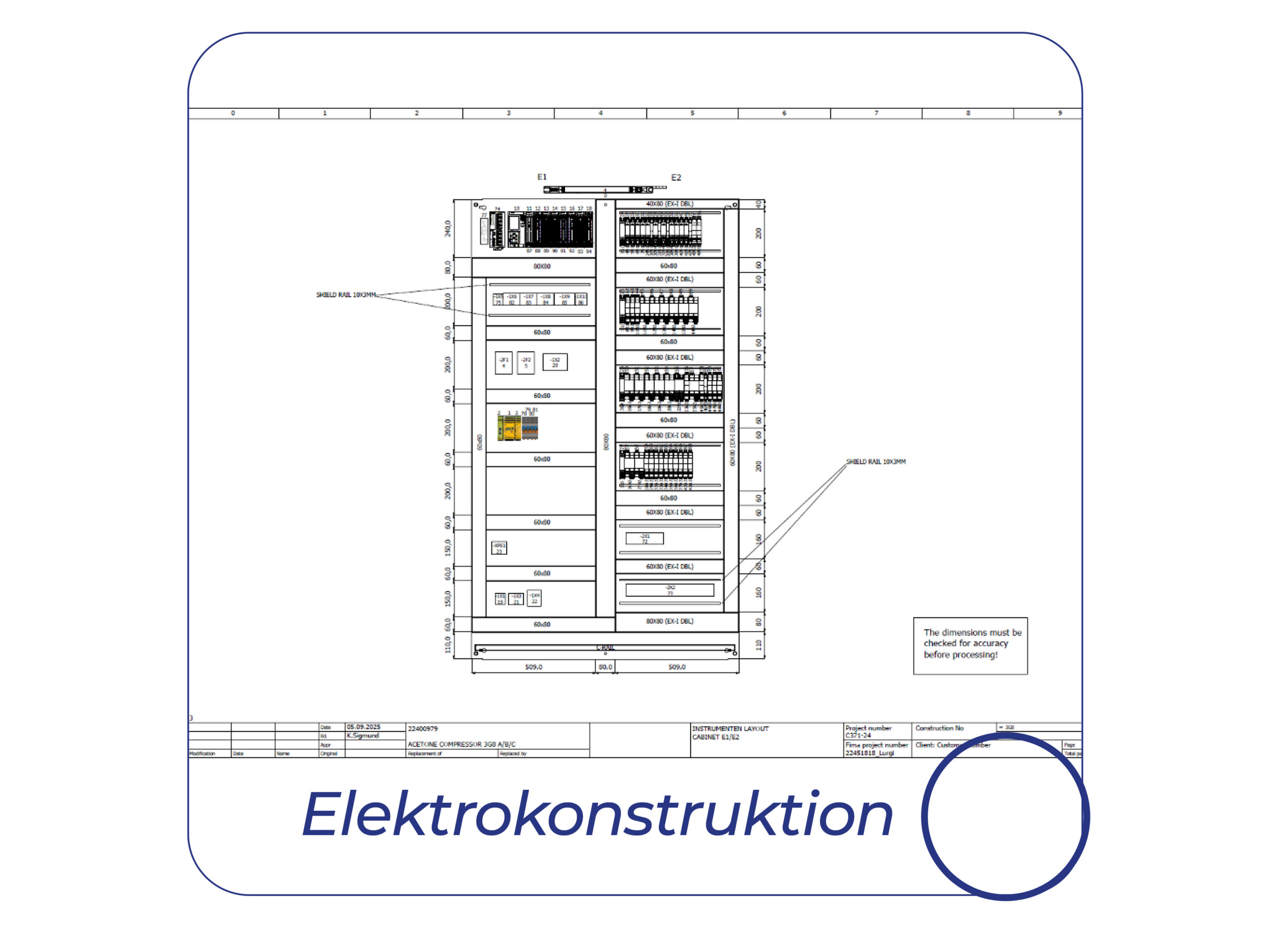 Die elektrische Konstruktion und Dokumentation wurde mit EPLAN Electric P8 2025 erstellt und umfasst Schaltplan, Aufbauplanung sowie Fertigungsunterlagen. Ebenfalls den Schaltschrankbau mit automatisierter mechanischen Bearbeitung mit 3D Laser.