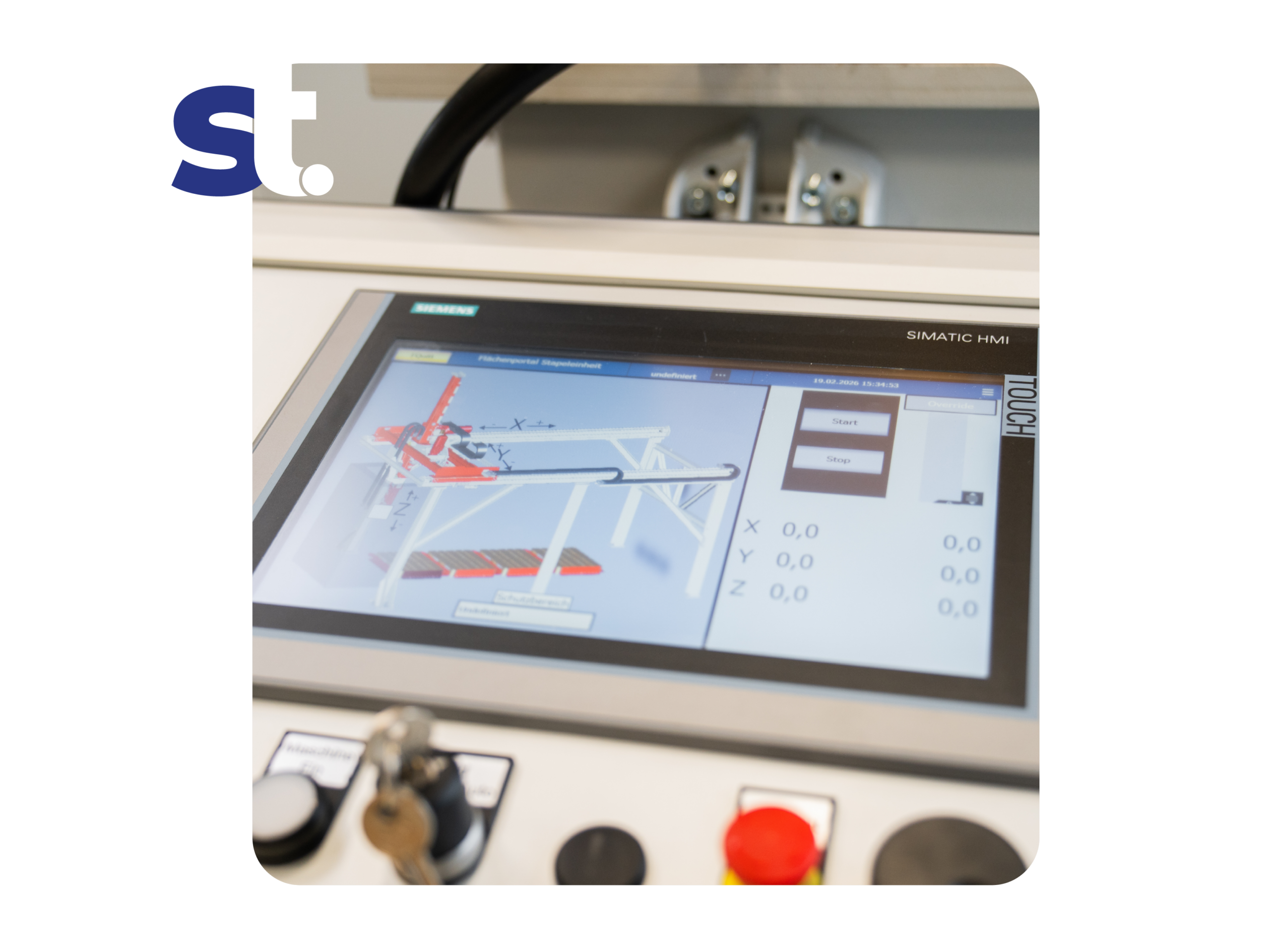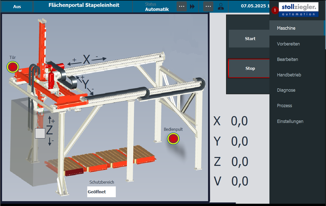Im Rahmen dieses Projekts wurde ein Flächenportal realisiert, das gesägte Rohteile einer Band- bzw. Kreissäge automatisch entnimmt und sortiert auf Paletten ablegt. Die Steuerungstechnik umfasst die Auslegung, E-Konstruktion mit EPLAN P8 V2.9, Softwareerstellung, Installation und Inbetriebnahme. Die Safety-SPS S7-1513F-2 mit TIA Portal V19 und TP 1200 Comfort sorgt für zuverlässige Prozess- und Sicherheitstechnik.