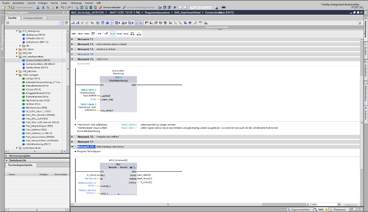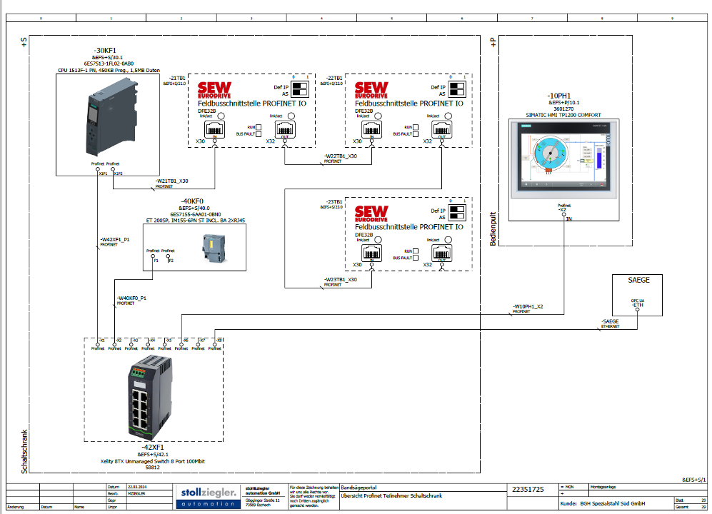 Die Kommunikation zwischen Säge und Palettieranlage erfolgt über OPC UA, ergänzt durch eine fest verdrahtete Schnittstelle für Not-Halt und Schutzkreis. Pneumatische Schwenkantriebe sowie das SEW-Antriebssystem über Profinet ermöglichen ein präzises Handling der Rohteile.