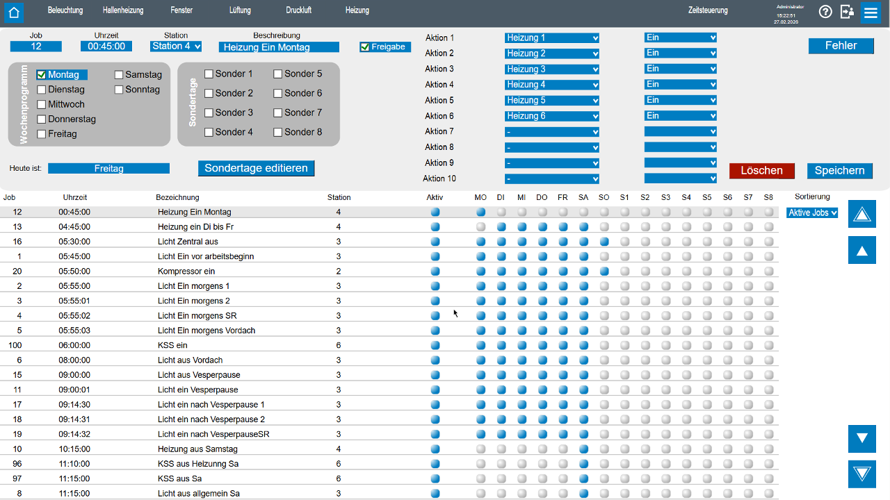 Im Zentrum des Projekts stand eine frei programmierbare, wochenbasierte Zeitsteuerung, die maximale Flexibilität für die Gebäudesteuerung bietet. Bediener können: